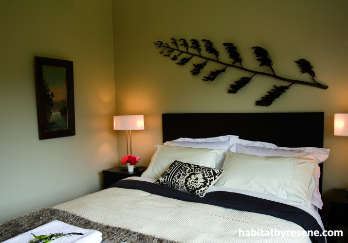 A simple restful palette of browns and creams for the bedroom with and inventive flax flower artwork.