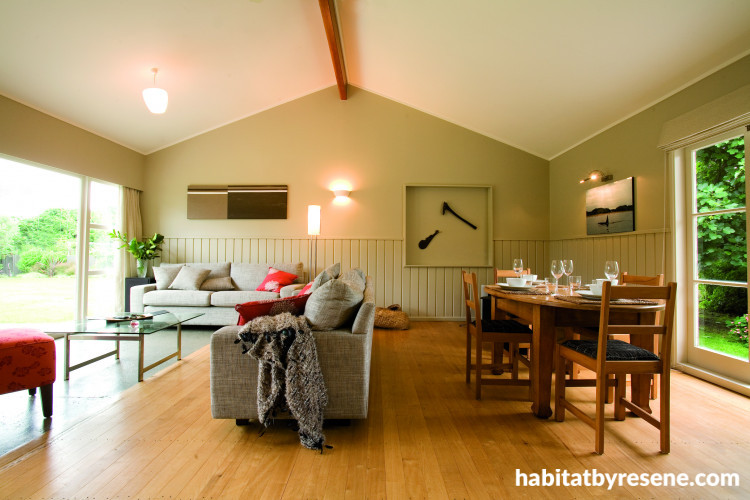 Textural elements include panels of tongue-and-groove to dado height with walls painted Resene Half Tea. Touches of red pop out against the warm tones. This is the living room of the Mara cottage.