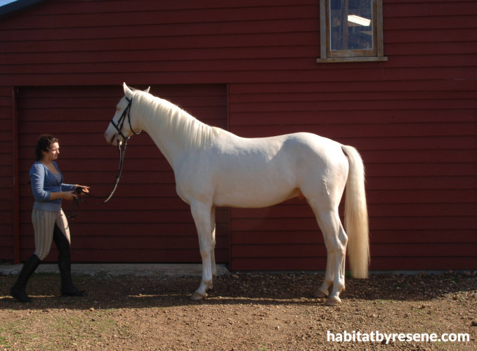 Anne’s magnificent white Oldenburg stallion, Ike, in front of the barn, painted in Resene Kenyan Copper. The barn has Resene Mondo bargeboards (not pictured). All the farm buildings are this colour scheme.