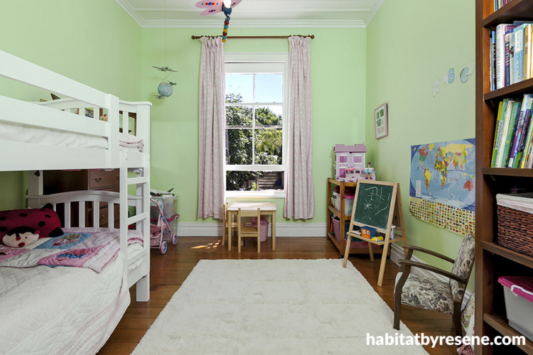 Daughter Amara’s room may be girly but it’s certainly not pink. Resene Reef is a happy and young sprout green – perfect.