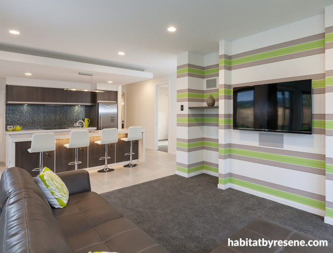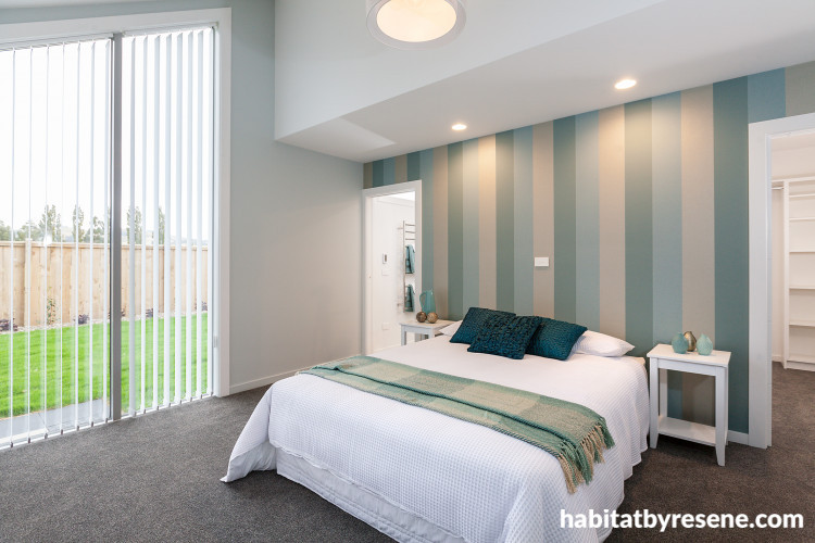 A unisex striped wallpaper (Room 20 8803-90) decorates the bedhead wall in the master bedroom and teams beautifully with walls in Resene Half Emerge - the colour visitors love. The bulkhead ceiling is Resene Alabaster. The interiors were designed by Lee-Anne Flockton ([email protected]).