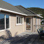 We used Resene Triple Malta for the weatherboards, Resene Half Nullarbor for the window surrounds and Resene Biscotti for the fascia boards and concrete ring wall.