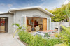 Bifold doors create indoor-outdoor flow from the living area to the patio and garden. The exterior of the house has been painted with Resene Double Napa, except for the soffits, which are painted with Resene Quarter Napa.