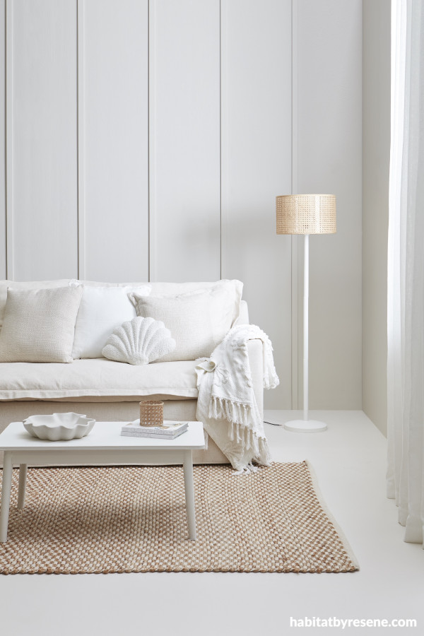 Add textured and nature-inspired finishes to airy whites and mutable off-whites to emphasise a sense of serenity and escape from distraction. Walls and battens in Resene Tea, with floor painted in Half Tea. Lamp base and coffee table in Double Rice Cake, shell dish in Half Tea. Rug from Mocka, throw and shell cushion from Adairs. Project Vanessa Nouwens. Image Wendy Fenwick