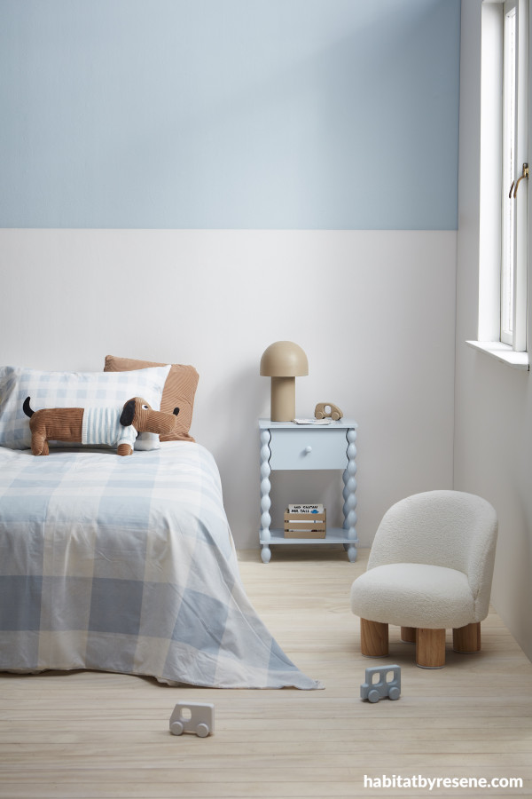 The right breezy white paired with a soft blue evokes the carefree, airy summer skies, perfect for a soothing child’s room. Upper wall in Resene Half Halcyon, lower wall in Quarter Blanc, floor washed in Colorwood Whitewash, lamp and crate in Nullabor, cars in Nullarbor, Half Halcyon and Quarter Blanc. Chair from Mocka, cushions, bedside table and bedding from Kmart, dog toy from H&M. Project Vanessa Nouwens. Image Wendy Fenwick.