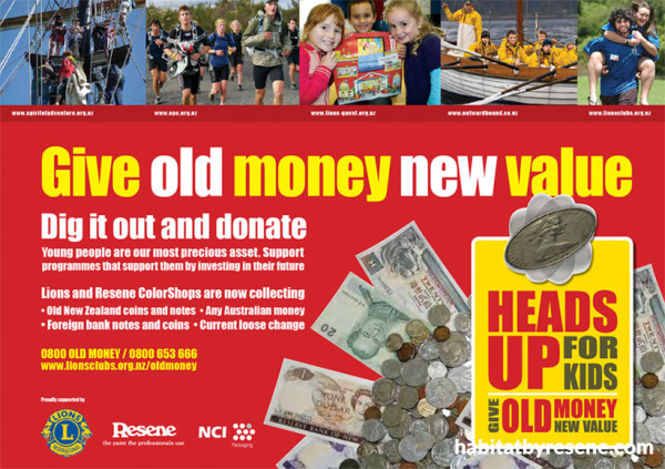 You can donate by simply taking in your old money and foreign currency to any Resene ColorShop and anywhere you see a Heads Up for Kids collection tin.