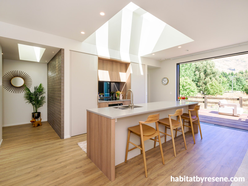 “This home is actually some of our staff's favourite. It's in such a quiet, almost undiscovered area of Wānaka that the home is a nice, wee hideaway. The flow is very open, with the 2.7m ceiling in the living, dining, lounge area, tied in with the lightness of Resene Rice Cake and Velux skylights, it really has a relaxing, calming feel to the place.”