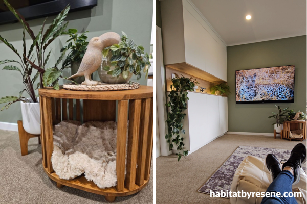 The entertainment wall in the lounge is painted in Resene Field Day, a peaceful, welcoming green. The cat bed is stained in Resene Colorwood Walnut.