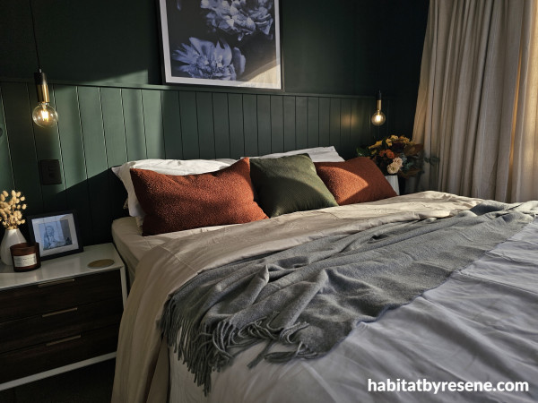 “After the reveals on the first week we realised just how much work the teams were putting in and decided on the second week to go big. We have plans to extend our house in the future and that meant building a new wall in the master bedroom to facilitate a future ensuite. We had decided we wanted a dark moody, cosy cottage bedroom and the Pinterest board was epic. We had agreed on creating a built-in headboard with V panelling and initially that was going to be the only dark wall however inspiration took over and we painted all four walls in Resene Midnight Moss with Resene Quarter Black White on the trims. This is BY FAR my favourite room.”