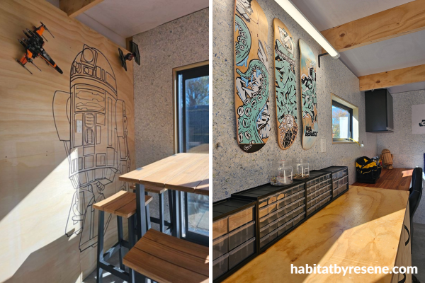 Chris’ mancave is playful and packed with personality, with walls in saveBOARD, a sustainable building choice, and a large Star Wars graphic painted in Resene Black.