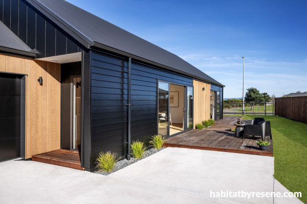 On the exterior, Resene Black creates a stunning contrast to the vertical timber panelling and landscaped yard.