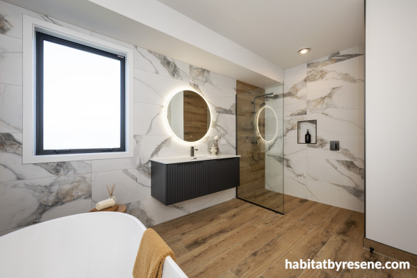 The bathroom is a stylish retreat with walls and ceiling painted in Resene Wan White, complementing the timber flooring and tiles.