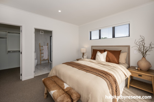 Earthy tones in décor and linen offer a calming environment in this bedroom. The walls are painted in Resene Wan White.