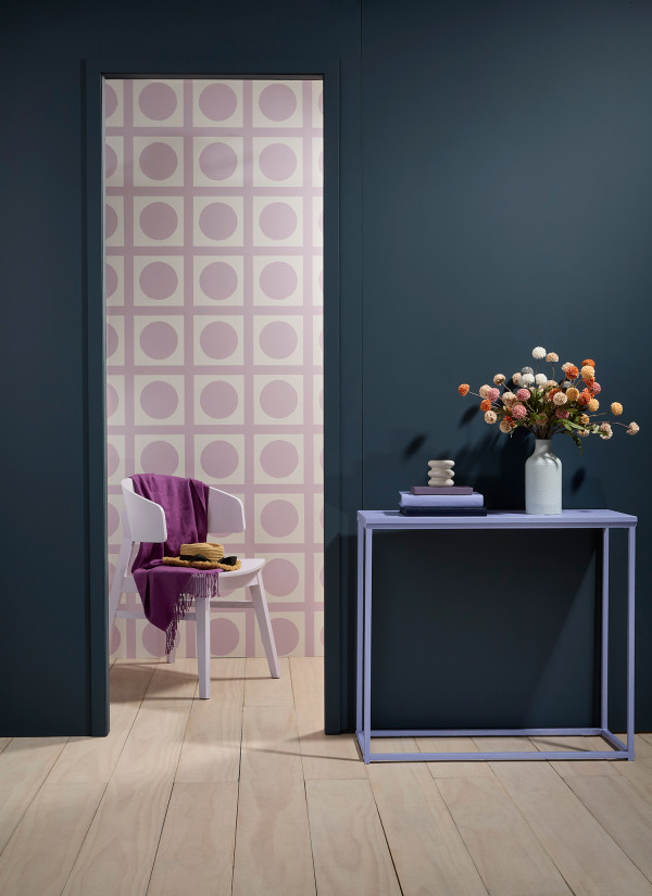 Add pops of purple to suit your taste, like Resene Heliotrope on this console table, Blue Chalk on the chair and Petal paired with Double Alabaster on the patterned wall. The walls are in Resene Coast and floor stained in Resene Colorwood Breathe Easy. Project by Annick Larkin, image by Bryce Carleton.