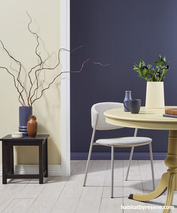 This back wall is painted in the blackened purple of Resene Revolver, with trims in Mulled Wine, floorboards in Resene Colorwood Breathe Easy, front wall in Astra, trims in Half Gin Fizz, table in Teak and Putty, side table in Resene Colorwood Deep Purple, vase in Cumin. Project by Moneuan Ryan, image by Bryce Carleton.