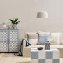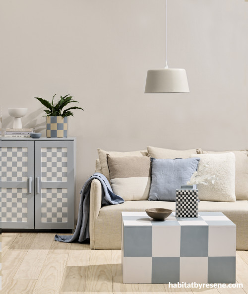A smaller palette of soft muted colours keeps these different check surfaces fun and fresh instead of chaotic. In this living room the wall is painted in Resene Eighth Joss, coffee table and sideboard in Resene Dusted Blue and Resene White Linen, large check planter in Resene Regent Grey and Resene Doeskin, candleholder and pendant in Resene Doeskin, bowl in Resene Tobacco Brown and planter in Resene Black and Resene White Linen. Sofa from nood, boucle cushion from Lune and Co, blue linen cushion and matching throw from H&M Home, artwork from Simply Creative. Project by Vanessa Nouwens, image by Bryce Carleton.