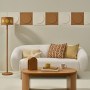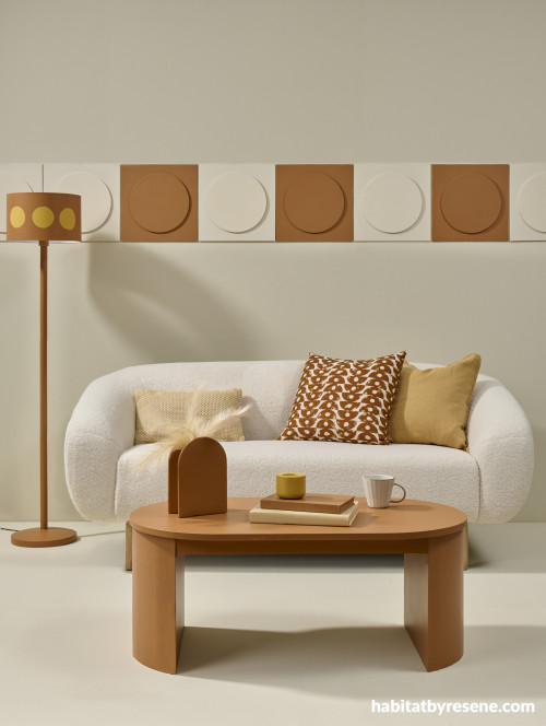 In this groovy, earthy toned living room, the wall and floor are painted in Resene Spanish White, coffee table in Resene Toffee, tealight holder in Resene Tussock, retro DIY tiles in Resene Spanish White and Resene Toffee, books in Resene Tussock, Resene Toffee and Resene Smooth Operator and lamp in Resene Toffee with spots in Resene Tussock. Sofa from Nood, mustard toned linen cushion from H&M Home, charm print cushion from Farmers. Project by Vanessa Nouwens, image by Bryce Carleton.