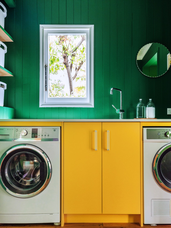 Laundry cabinetry in Resene Bright Spark, walls in Crusoe.