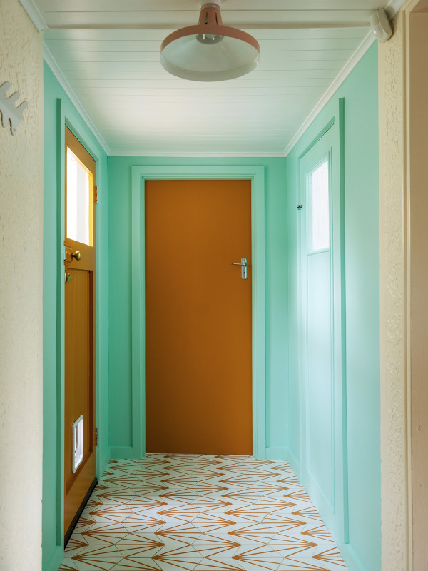 Hallway walls in Resene Vista Blue, doors in Mai Tai.