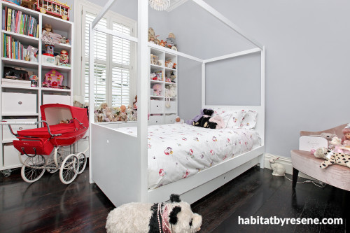 Little Violet’s bedroom with a four poster bed that’s just perfect for this particular princess, has walls in Resene Heather, a cool grey shade with just a hint of purple.