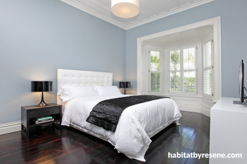 The couple chose Resene Dusted Blue for the walls in the master bedroom, a moody mix of green and blue. Resene Milk White and Resene Porcelain positively glow on the trims and accents.