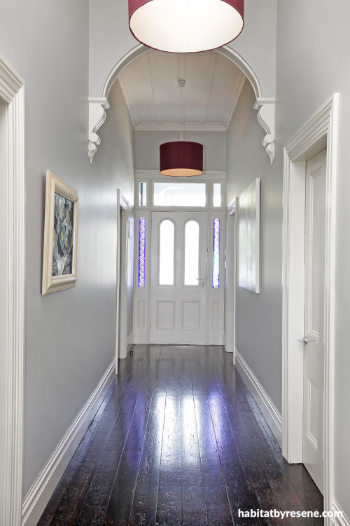 Resene Copyrite is used in the hall, just one of the wide palette of pale greens, blues and stone tones used throughout the house.