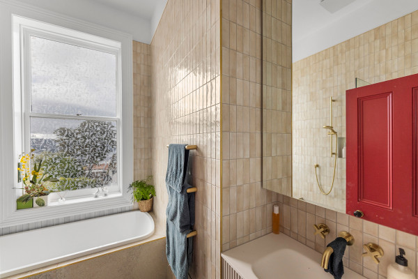 The bathroom trims and ceiling in Resene Alabaster provide a gentle contrast to the golden tiles. The door is painted in the bold Resene Pohutukawa.