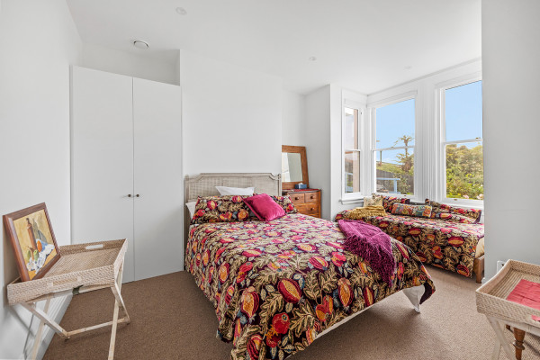 The bedroom is bright with a neutral base of Resene Half Merino on walls and Resene Alabaster on the ceiling. A fresh backdrop for the owner’s belongings and décor.