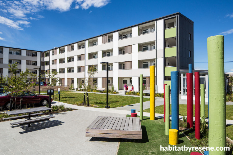 The Multi-Residential Exterior award went to Opus Architects for the Kotuku Flats upgrade for the Wellington City Council using feature colours like Resene Buddha Gold, Resene Pohutukawa, Resene Koru and Resene Bellbottom Blue.