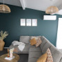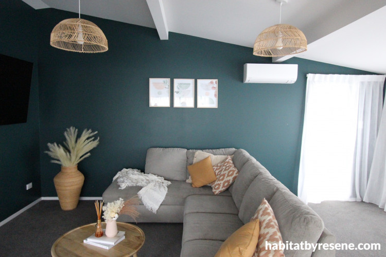 The living room is now painted in Resene Tiki Tour, a complex spruce green of native travels, deep and traditional. Krystal had always loved the depth and shade of Resene Tiki Tour and knew she wanted it in her living room, so this was the first colour chosen and the house had to work around it. Darker colours like this are great for living rooms and media rooms, creating a cosy cinematic vibe.