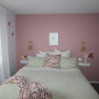 A calming pink shade was used for the master bedroom, Resene Pale Rose, creating a calm and relaxing atmosphere for a place of rest. The pink looks lovely against the gentle green bedding. The ceiling is painted in Resene House White.