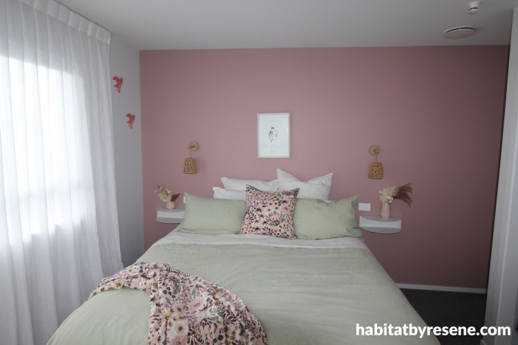A graceful touch of shell rose pink, Resene Pale Rose, was chosen for the master bedroom. The couple wanted something calming, but that also had colour, and with pink emanating feelings of warmth, happiness and relaxation, this was the perfect choice for their room.