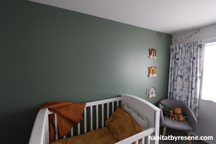 Another Resene green was chosen for her son Max’s room. Deciding to do a feature wall, Krystal chose Resene Half Rivergum, a water green, softly shadowed with depth. This stunning shade, next to walls in Resene House White, allowed them to add fun and playful décor to Max’s room, such as animal prints and gorgeous shades of ochre which complement the green.