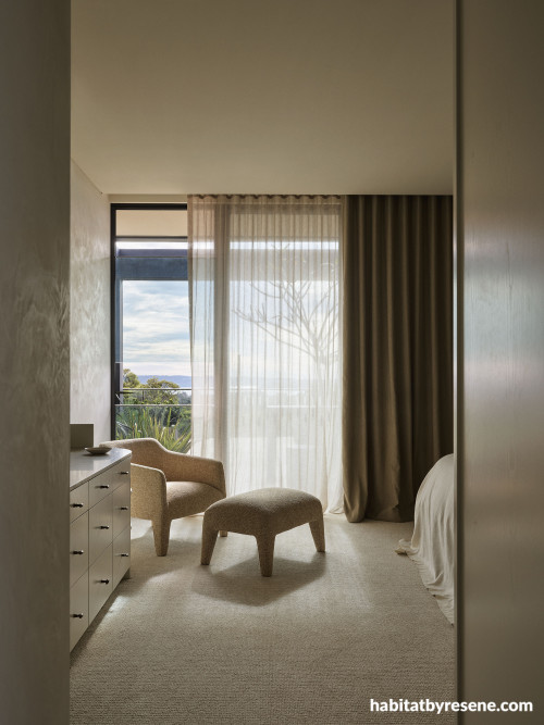 Rockcote Otsumigaki painted in Resene Double Rice Cake resumes in the bedroom, blending with the ceiling and surrounding walls in the same creamy neutral.