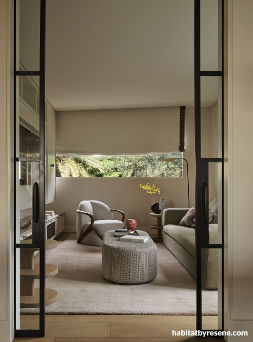 Through darker framed doors, the snug invites its homeowners in for an evening of reading or movie watching. The walls and ceiling are painted in Resene Double Rice Cake.