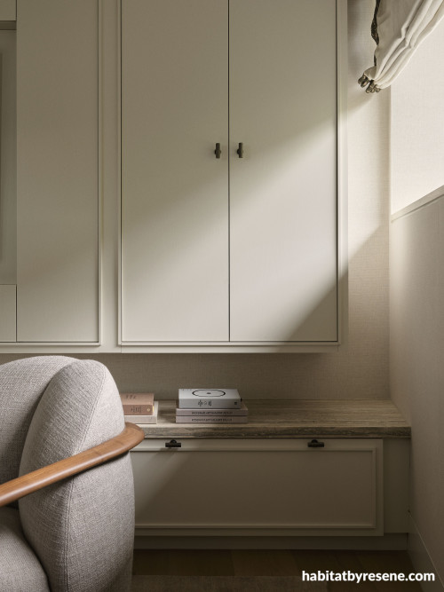 Inside the snug, custom cabinetry is painted in Resene Double Rice Cake to blend with the walls.