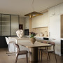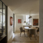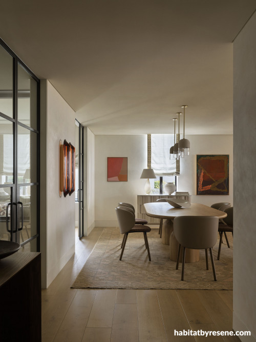 Rockcote Otsumigaki painted in Resene Double Rice Cake continues into the dining room, where unique artwork and classic furniture create a stunning space to dine and entertain.