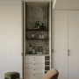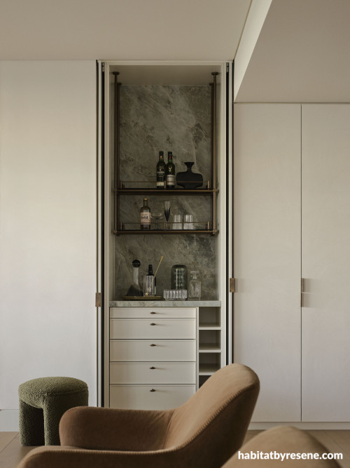 A hidden bar with green quartzite stone reveals itself through cabinetry painted in Resene Double Rice Cake.