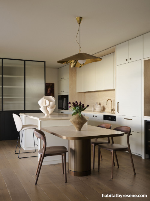 The kitchen cabinetry and ceiling in Resene Double Rice Cake create an inviting space in the heart of this home.