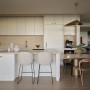 The living room takes on a unique twist with Rockcote Otsumigaki, painted in Resene Double Rice Cake, adding texture and depth while maintaining the elegant, serene atmosphere. The special finish of Rockcote Otsumigaki plays with light across the walls, adding an intriguing touch to the open-plan space.