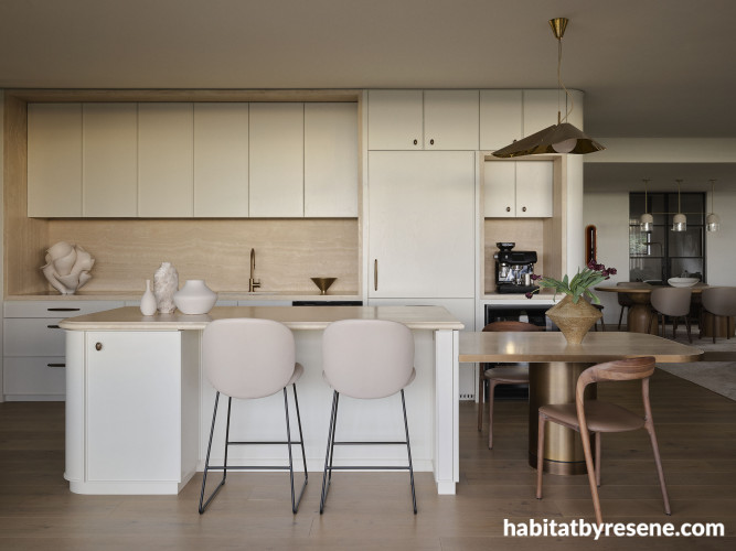 The creamy tones in Resene Double Rice Cake are complemented by the vein-cut Classico travertine, timber elements and elegant décor in the kitchen.