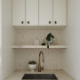 The bedrooms are adorned in the same buttery neutral, creating a cohesive space throughout the home, with added touches of earthy toned décor. The design also extends to the laundry where the monochromatic palette is punctuated by a mosaic stone splashback, adding visual interest to a practical yet beautiful room.