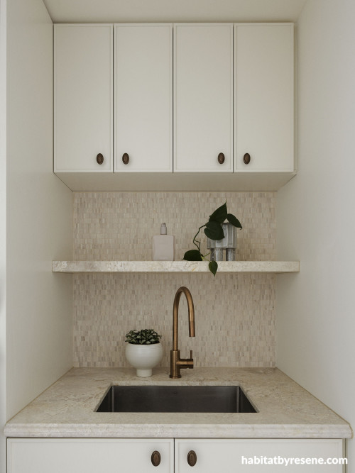 The laundry features a mosaic stone splashback with soft warm tones to complement the cabinetry and walls in Resene Double Rice Cake.