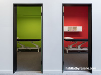 For the design of In Good Hands Physio, Michael Cooper Architects used a number of electric statement colours to bring energy to the dynamic space. Resene Limerick (left) and Resene Red Hot (right) do a bang-up job of helping to motivate patients to get moving in these two treatment rooms while the walls of the hallway have been kept neutral in Resene Black White.