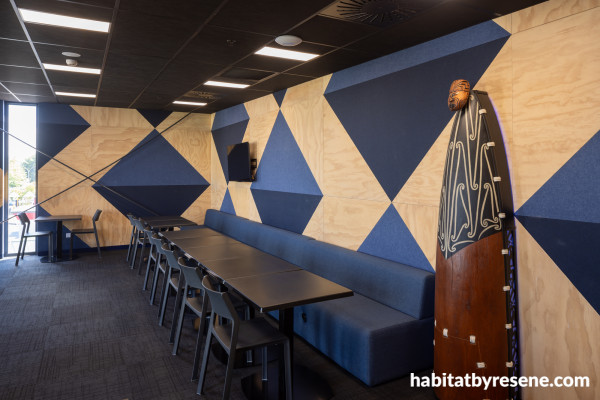 In the Te Whare Wananga on level one, the Poutama pattern comes to the fore through plywood finished in Resene Aquaclear and acoustic panels. The walls are painted in Resene Duck Egg Blue, a cool, tranquil hue that fosters trust and openness. “Moving further into the first‐floor therapy spaces Resene Merino facilitates a warm, calm transition, where a warm autumn palette including Resene Billabong, Resene Fahrenheit, Resene Chocolate Lounge and Resene Noosa are used to colour block spaces,” says Werner.