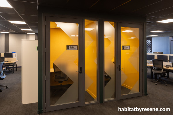 Hallways and meeting rooms feature vibrant yet grounded hues like Resene Racing Green and Resene Fahrenheit. Image by Jay Drew.
