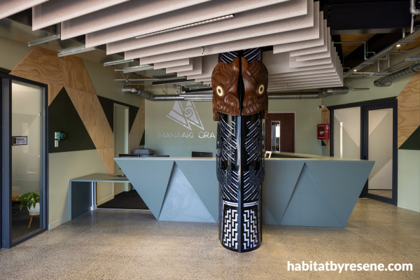 “At the start of the project, Manaaki Ora Trust set a challenge for the design team to create a culturally representative, warm, inclusive, non‐clinical counselling facility for their clients and team,” says Werner Naudé from DCA. The primary concept was to create a vertical marae, grounded in Te Arawa narratives and brought to life through form, material and Resene colour.