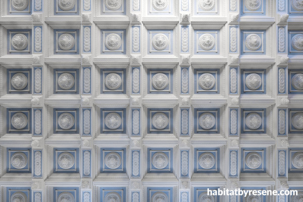 This project is finished in: Resene Duck Egg Blue,Quarter Thorndon Cream, Eighth Ironsand, Villa White, Friar Greystone, Gecko, Half Raven, Pioneer Red, Double Stack and Resene FX Metallic Solid Gold. Photographer: Jason Mann.