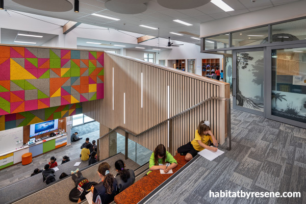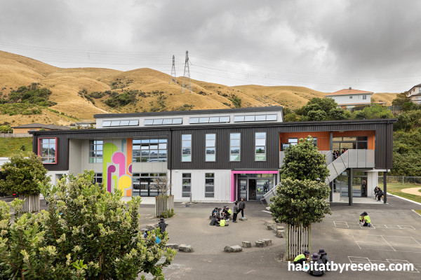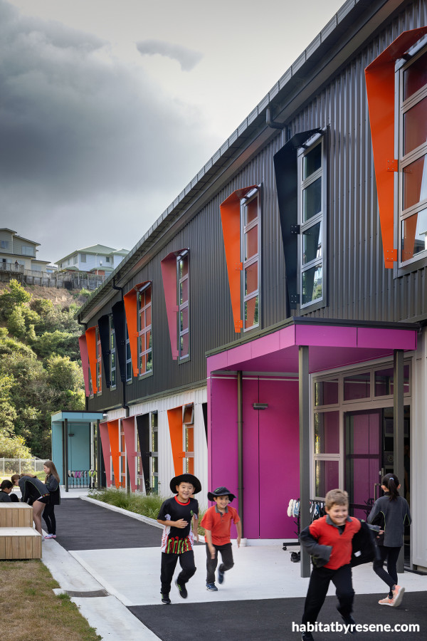 Now, with a rising roll and the suburb continuing to expand, the school has added a new two-storey building that extends the original design – and once again, colour plays a leading role.