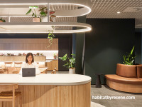 Different-sized meeting and event spaces wrap around a central core with shared workspace amenity anchored in the south-east corner of the floor plate. In contrast to the ground floor, the event, meeting and offices spaces are light and bright using warm timber with Resene Black White painted on the walls and ceilings.